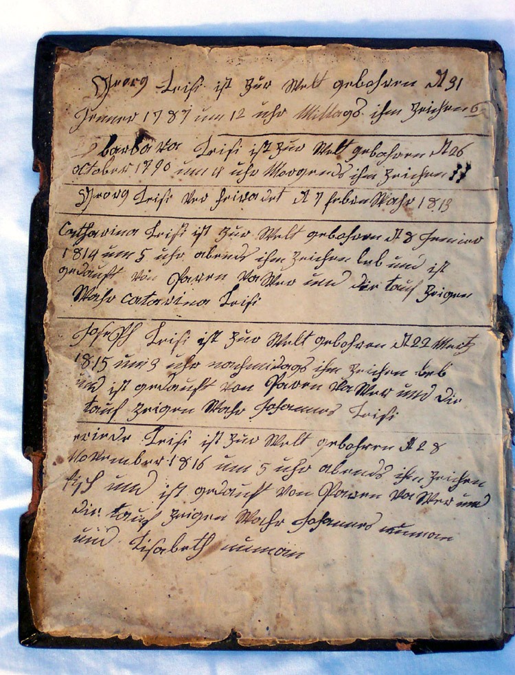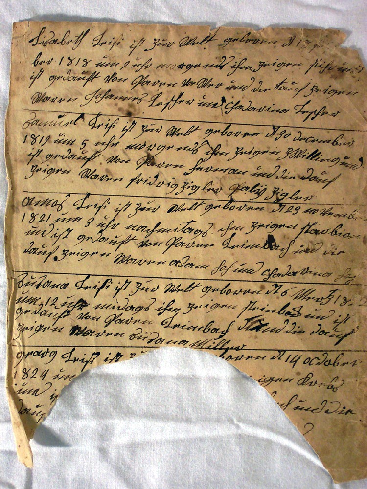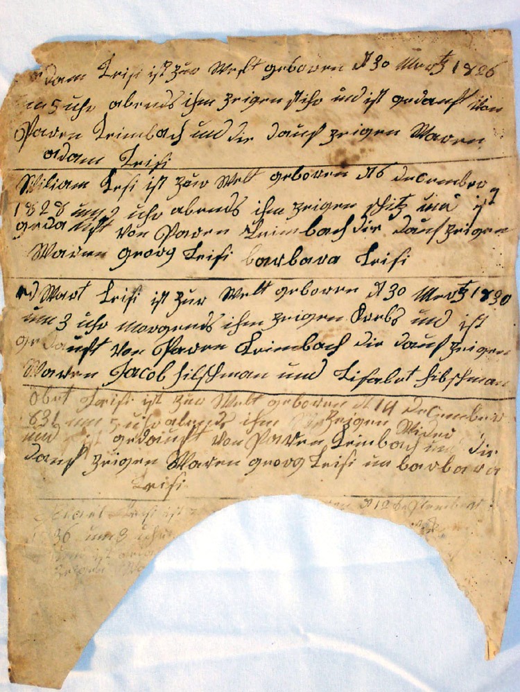 Among her comments about the Bible, Ms. Durnbaugh noted that it was interesting that all of the entries were of births and only one marriage. The inscriptions are written in an old dialect of German and begin with George Leisey (2nd generation, Joseph & Sophia’s son). The names are most likely of George and Barbara’s family. It includes dates of births, marriages, and baptisms. Because the children were baptized as infants, the Leiseys were probably Lutheran or another form of reformist.