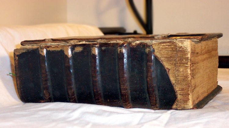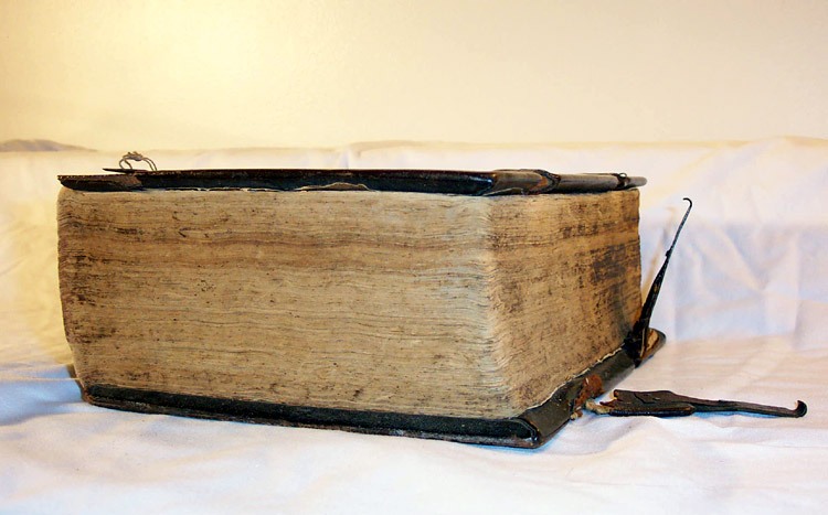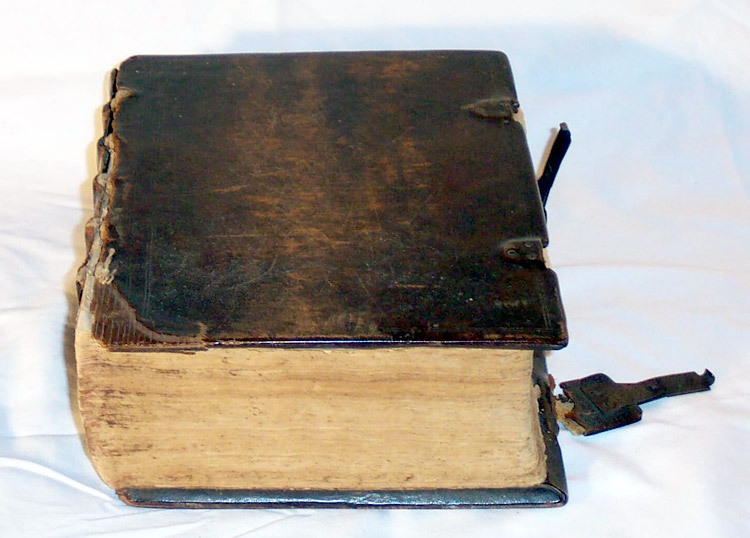 Ms. Durnbaugh said that the Bible is in good shape because it has no mold and that the first two parts of this kind of Bible to go are the latches and the front cover (which have happened in this case). The paper is made from rye, and is, therefore, durable.