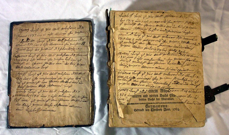 The entries in this Bible were translated by library archivist Hedda Durnbaugh at Juniata College in Huntingdon, PA, Friday, April 25, 2008.