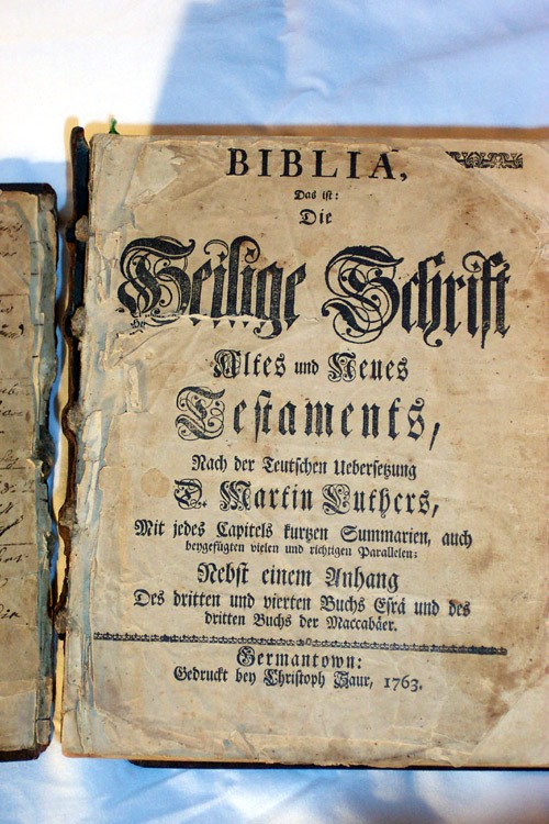 This Bible is the second edition of Christopher Saur Bibles printed in Germantown, PA, in 1763. This edition was printed by the son of the original Christopher Saur. The first Christopher Saur was a master of about thirty trades. He was the first to print a Bible in a European language in the Americas. Prior to this, the Oxford Press had a monopoly on printing. This particular Bible looks as if it were damaged by water at one point.