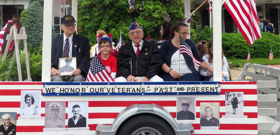 The pictures at the bottom of the float on the right side are: Alvin Leisey, Melvin T. Leisey, a gunnery mate on an LST that was one of the few LSTs to survive the Battle of Omaha Beach at Normandy France during WWII and Mary Helen Leisey, wife of Alvin L. Leisey, Jr., who was a Nurse in the Cadet Nursing Corp in Deshon Army Hospital during WWII.